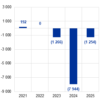 Der Verlust der EZB belief sich 2025 auf 1 254 Mio. €, im Vergleich zu einem Verlust von 7 944 Mio. € im Jahr 2024. Nach einem Beschluss des EZB-Rats wird dieser Fehlbetrag in der Bilanz der EZB als Verlustvortrag ausgewiesen und mit künftigen Überschüssen verrechnet.