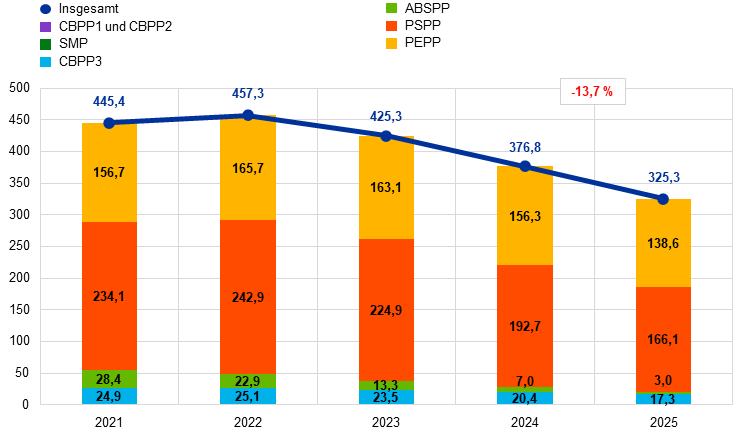 Auf der Grundlage der einschlägigen Beschlüsse des EZB-Rats stellte das Eurosystem die Wiederanlage der Tilgungsbeträge der im Rahmen des APP und des PEPP erworbenen Wertpapiere bei Fälligkeit ab Juli 2023 bzw. Ende 2024 ein. Diese Beschlüsse führten dazu, dass die von der EZB zu geldpolitischen Zwecken gehaltenen Wertpapieren in einem maßvollen und vorhersehbaren Tempo zurückgingen. Im Jahr 2025 verringerten sich die geldpolitischen Portfolios um insgesamt 51,5 Mrd. € auf 325,3 Mrd. € (siehe Abbildung 2). Das APP-Portfolio verringerte sich um 33,7 Mrd. € auf 186,5 Mrd. €, wobei sich die Bestände des PSPP, des ABSPP und des CBPP3 um 26,5 Mrd. €, 4,0 Mrd. € bzw. 3,1 Mrd. € reduzierten. Das PEPP-Portfolio verringerte sich um 17,8 Mrd. € auf 138,6 Mrd. €.