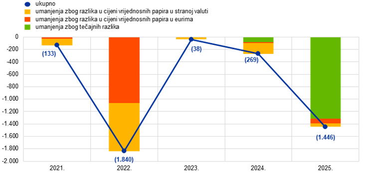 Devizna sredstva ESB‑a u američkim dolarima, japanskim jenima i kineskim juanima renminbijima, izražena u eurima, smanjila su se u 2025. za 4,8 mlrd. EUR na 55,2 mlrd. EUR (Grafikon 5.), uglavnom zbog deprecijacije američkog dolara i japanskog jena u odnosu na euro.[15] Zbog deprecijacije američkog dolara smanjila su se i salda na računima revalorizacije ESB‑a (vidi odjeljak 1.3.2. Neto kapital) a zbog deprecijacije japanskog jena došlo je do umanjenja zbog tečajnih razlika priznatog u računu dobiti i gubitka na kraju godine jer su povezani računi revalorizacije bili potpuno ispražnjeni u 2024. (vidi odjeljak 1.3.3. Račun dobiti i gubitka). Unatoč umanjenju držanja u japanskim jenima povećala su se zbog uobičajenog restrukturiranja radi usklađenja sastava deviznih pričuva ESB‑a s ciljnom raspodjelom. U sklopu restrukturiranja ESB je tijekom prvog tromjesečja 2025. prodao malen dio držanja u američkim dolarima i u potpunosti reinvestirao prihode u držanja u japanskim jenima.