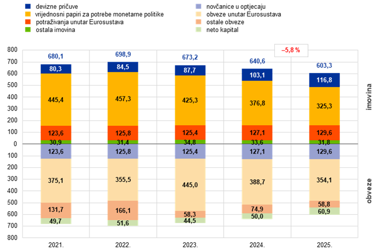 Bilanca ESB‑a smanjila se u 2025., i to za dodatnih 37,3 mlrd. EUR na 603,3 mlrd. EUR, čemu je ponovno pridonio otkup vrijednosnih papira u sklopu APP‑a i PEPP‑a. Ti su otkupi doveli do smanjenja portfelja vrijednosnih papira koji se drže za potrebe monetarne politike a gotovinska namira tih transakcija u sustavu TARGET dovela je do odgovarajućeg smanjenja obveza unutar Eurosustava. To je smanjenje tek djelomično neutralizirano odljevom gotovine zbog smanjenja depozita kod ESB‑a te su se zato istodobno smanjile i ostale obveze.