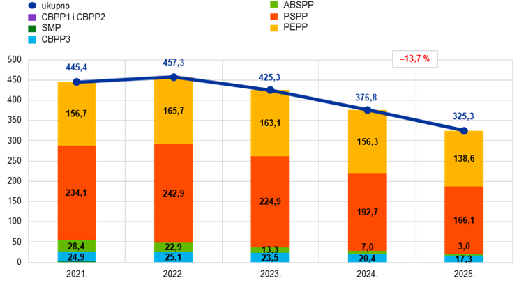 Na temelju odgovarajućih odluka Upravnog vijeća Eurosustav je prestao reinvestirati glavnice dospjelih vrijednosnih papira u sklopu APP‑a od srpnja 2023. i u sklopu PEPP‑a na kraju 2024. Zbog tih su se odluka vrijednosni papiri koje ESB drži za potrebe monetarne politike smanjivali umjerenom i predvidljivom dinamikom. Portfelji koji se drže za potrebe monetarne politike ukupno su se u 2025. smanjili za 51,5 mlrd. EUR na 325,3 mlrd. EUR (Grafikon 2.). Portfelj APP‑a smanjio se za 33,7 mlrd. EUR na 186,5 mlrd. EUR, i to za 26,5 mlrd. EUR u sklopu PSPP‑a, za 4,0 mlrd. EUR u sklopu ABSPP‑a i za 3,1 mlrd. EUR u sklopu trećeg CBPP‑a. Portfelj PEPP‑a smanjio se za 17,8 mlrd. EUR na 138,6 mlrd. EUR.