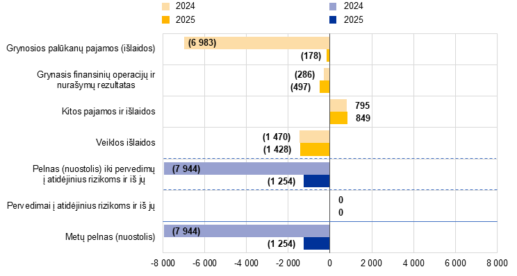 2025 m. ECB nuostolis sudarė 1 254 mln. eurų, palyginti su 1 744 mln. eurų nuostoliu 2024 m. Valdančiosios tarybos sprendimu, šis nuostolis bus rodomas ECB balanse ir dengiamas būsimųjų laikotarpių pelnu.