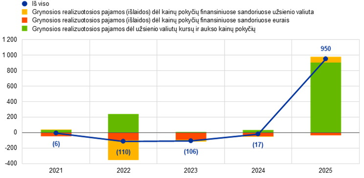 Padidėjus aukso rinkos kainai eurais, ECB turimo aukso vertė eurais 2025 m. padidėjo 18,9 mlrd. – iki 59,8 mlrd. eurų (žr. 4 pav.). Dėl šio padidėjimo atitinkama suma išaugo ir ECB aukso perkainojimo sąskaitos (žr. 1.3.2 skirsnį Grynoji nuosavybė).