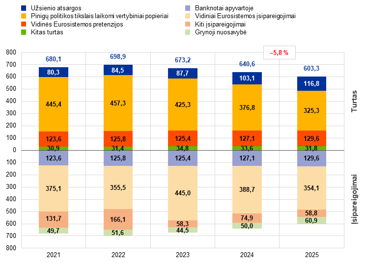 2025 m. ECB balansas sumažėjo dar 37,3 mlrd. – iki 603,3 mlrd. eurų, taip pat daugiausia dėl pagal TPP ir SPPP laikomų vertybinių popierių išpirkimų. Dėl šių išpirkimų sumažėjo pinigų politikos tikslais laikomų vertybinių popierių portfelis, o dėl piniginių atsiskaitymų už šiuos sandorius per TARGET sąskaitas atitinkamai sumažėjo vidiniai Eurosistemos įsipareigojimai. Šį sumažėjimą tik iš dalies kompensavo piniginių lėšų išmokos dėl į ECB padėtų mažesnių indėlių, o tai kartu nulėmė mažesnius kitus įsipareigojimus.