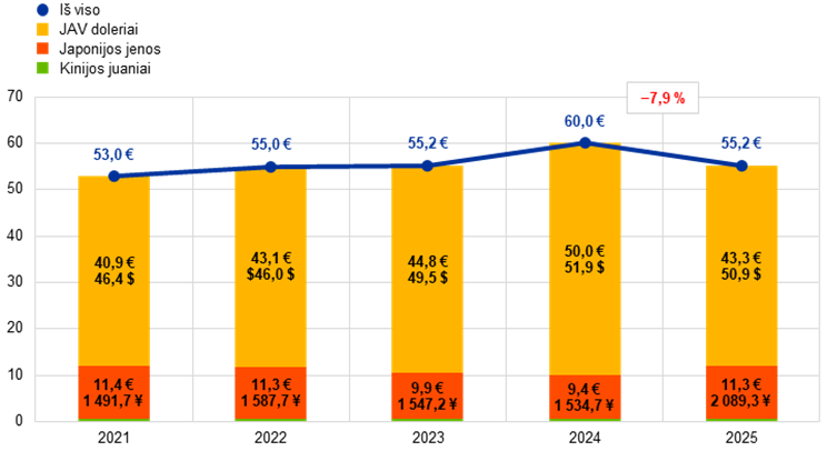 JAV doleriai ir toliau sudaro didžiausią ECB užsienio valiutos atsargų dalį – 78 % 2025 m. pabaigoje.