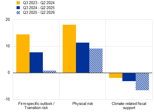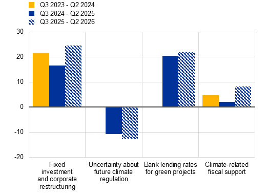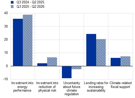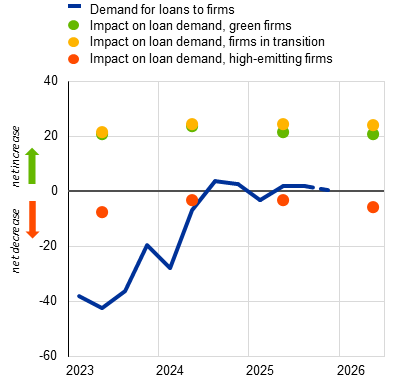 Banks consider the climate performance of firms and buildings in their lending policies. The euro area bank lending survey shows that lower climate risks tend to improve credit conditions. Meanwhile, green investments increase loan demand from firms and households.