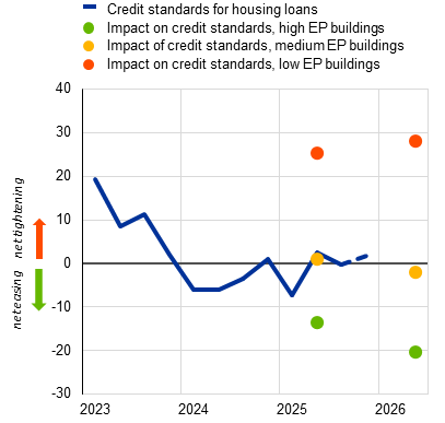 Notes: In panel a), “EP” denotes “energy performance”. Net percentages are defined as the difference between the percentages of banks reporting a tightening of credit standards (blue line) or a tightening impact of climate change (dots) and the percentages of banks reporting an easing or easing impact. The solid line refers to actual values over the past three months, while the dashed part of the line refers to banks’ expectations over the next three months. The dots refer to actual values in the past 12 months, except for the last dot, which refers to banks’ expectations for the next 12 months. Panel b) shows the main factors that contribute, according to the banks, to an easing (negative values) or tightening (positive values) impact of climate change on bank lending conditions. The climate-related question on housing loans was introduced in the July 2025 BLS.