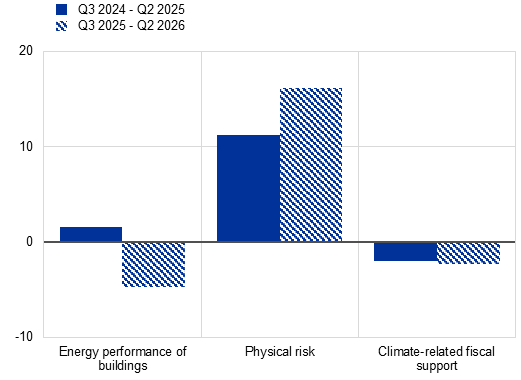 Looking ahead, based on banks’ expectations, the easing impact of energy performance for buildings with high energy performance could outweigh the tightening impact for buildings with low energy performance over the next 12 months. By contrast, the net percentage of banks expecting a tightening impact from physical risk has increased. Overall, better energy performance of buildings could continue to improve lending conditions for housing loans, while physical risk seems to be a concern for a growing share of banks. Also, similarly to firm loans, climate-related fiscal support is expected to continue to have a beneficial impact on bank lending conditions for housing loans.