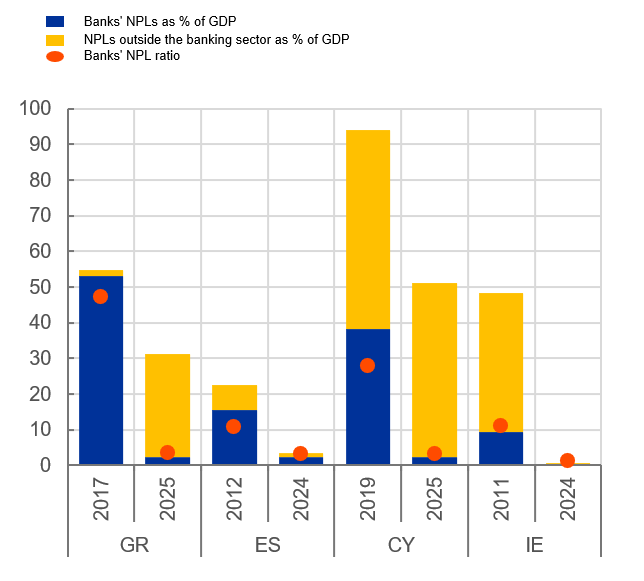 Notes: The first date for each country corresponds to the first year when NPLs started being transferred outside the banking sector. NPLs outside the banking sector are held by Nama in Ireland, Kedipes in Cyprus, Sareb in Spain, and various loan servicing companies in Greece. Data for Portugal are unavailable. For Ireland, GNI* is used instead of GDP. For 2025, data for Greece and Cyprus refer to September and December, respectively. For Ireland and Spain, data for 2025 for NPLs in Nama and Sareb were not yet available when this blog was published.