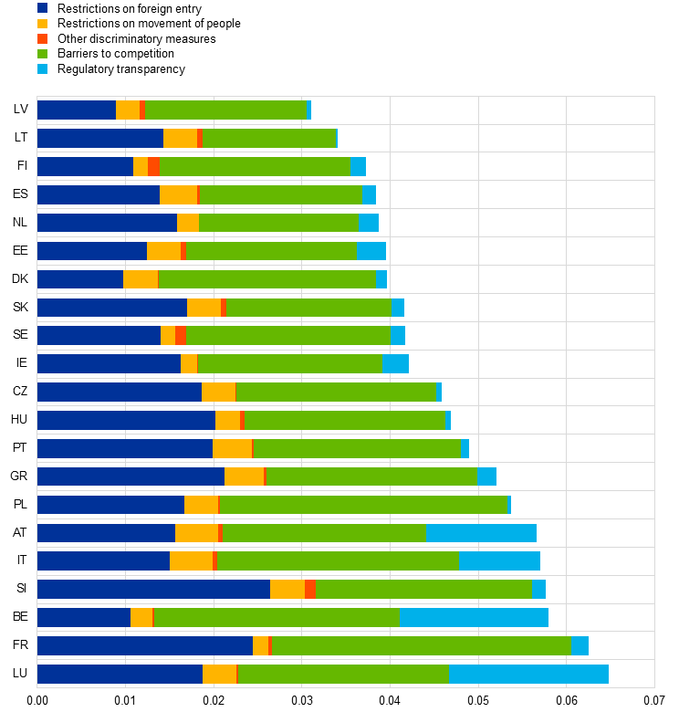 The data also indicate that restrictions on competition and foreign entry of firms form the bulk of the barriers within the Single Market for services. Data on barriers that hinder the functioning of the Single Market are limited also in the case of services. Still, the OECD STRI indicator can offer a useful proxy. Specifically, Chart 4 illustrates the distribution of barriers by policy area for EU countries, highlighting the relative importance of different types of barriers. Data point to a marked variation in the degree of services restrictions across EU Member States and categories. Some countries like Luxembourg and Belgium exhibit higher overall restrictiveness levels, largely driven by foreign entry and competition barriers, while others, such as Latvia and Lithuania, maintain comparatively open regulatory environments.[7]