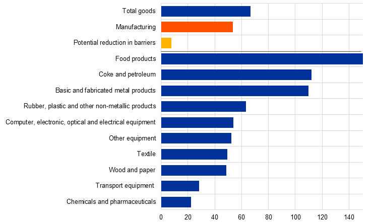 Nonetheless, the empirical estimates suggest that trade costs of intra-EU trade in goods remain high. Regression results (Chart 5, panel b) indicate that in 2022 intra-EU trade frictions for goods – i.e. the costs of trading with other EU countries relative to trading domestically – remain significant, at 67% on aggregate for goods and 54% when considering only the manufacturing sector.[16] Within manufacturing, intra-EU costs for food products are the highest, with an ad valorem tariff equivalent of 150%, which may reflect the complexity of food trade within the EU and the limited scope of the common agricultural policy. In contrast, intra-EU trade costs in the chemical and pharmaceutical sectors are lower, which may reflect the significant efforts towards harmonisation and mutual recognition tools in these sectors.