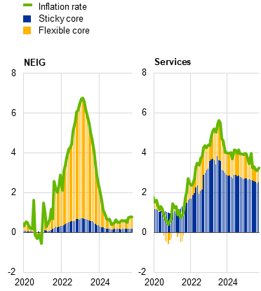 b) Contribution of sticky and flexible items to NEIG and services inflation