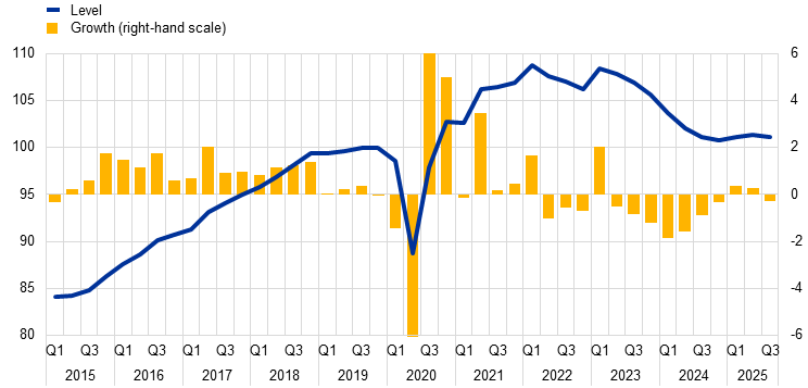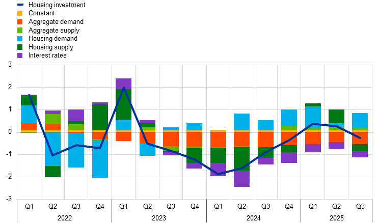 Euro area housing investment appears to have bottomed out, but a sustained recovery has yet to emerge. After increasing noticeably from mid-2015 to early 2022 – with a brief interruption during the COVID-19 pandemic-related downturn – housing investment declined relatively steadily from the first quarter of 2022 before reaching a trough in the fourth quarter of 2024 (Chart A). Although it picked up somewhat in early 2025, momentum has remained subdued. Housing investment declined by 0.2% in the third quarter of 2025 compared with the previous quarter, standing around 7% below its peak in the first quarter of 2022. Between the first quarter of 2022 and the third quarter of 2025, developments differed markedly across euro area countries. Among the largest euro area economies, such as Germany and France, housing investment declined substantially, while it increased in Italy and Spain.[1] This box uses a structural empirical model to decompose recent developments in euro area housing investment into their fundamental drivers and discusses the short-term outlook for housing investment growth.[2]