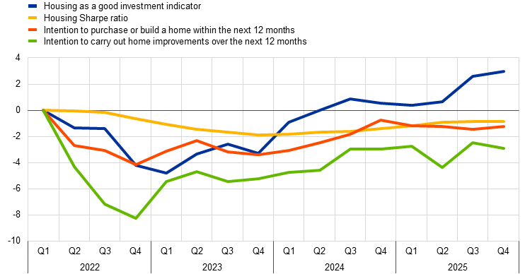 Notes: The housing as a good investment indicator measures the share of respondents in the CES who consider buying a property in their neighbourhood at present to be a “good” or “very good” investment. The housing Sharpe ratio is derived from households’ house price expectations in the CES combined with a measure of the risk-free interest rate (see Battistini et al., 2025). Short-term intentions to purchase or build a home and to carry out home improvements are taken from the European Commission’s consumer surveys and are reported as percentage balances. The CES data represent quarterly averages. The latest observations are for October 2025 for the CES data and the fourth quarter of 2025 for the European Commission data.