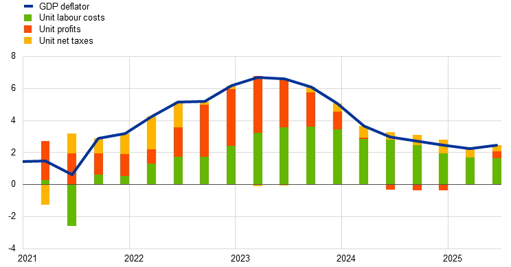 Indicators of underlying inflation remain consistent with the Governing Council’s 2% medium-term target. While firms’ profits are recovering, labour costs are set to moderate further owing to rising productivity and an easing in wage growth. Forward-looking indicators, such as the ECB’s wage tracker and surveys on wage expectations, point to slower wage growth over the remainder of 2025 and the first half of 2026.