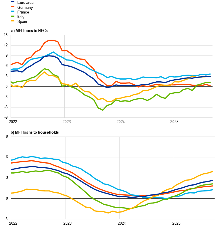 Notes: Loans from monetary financial institutions (MFIs) are adjusted for loan sales and securitisation; in the case of non-financial corporations (NFCs), loans are also adjusted for notional cash pooling. The latest observations are for September 2025.