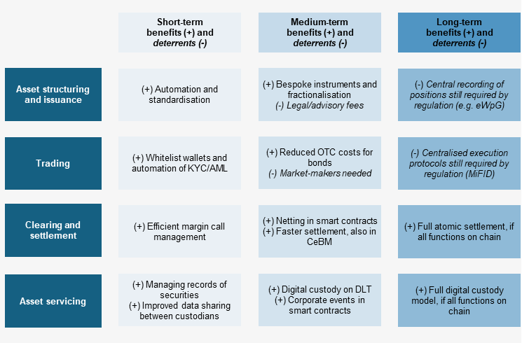 The benefits of DLT may play out differently over time; some might be realised in the short term, whereas others will only come to fruition in the long term. An ecosystem that gradually transitions to DLT, supported by closer integration and regulatory adaptation, will progressively unlock efficiencies over time, with varying impacts across the asset value chain (Figure 3). For example, more standardisation of asset structuring via smart contracts will likely have benefits relatively early on. Benefits in trading will likely only materialise in full over a longer period, when more automation of trades – for example through whitelisted wallets, which could replace many of the traditional manual processes related to identity checks, onboarding and trade eligibility – are paired with increased liquidity on chain (see Section 2.2).