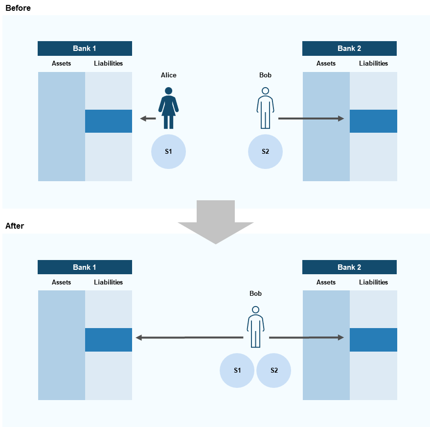 Notes: S1 and S2 are two different bearer tokenised deposits or deposit tokens, where S1 is originally owned by Alice and S2 is originally owned by Bob. D1 and D2 refer to two non-bearer tokenised deposits, where D1 is originally owned by Alice and D2 is originally owned by Bob. In Figure B, the positions in the lower section are shown for illustrative purposes. While at the moment of transfer, Bank 1 sends Bank 2 a volume of reserves equal to the size of the deposit transferred, banks generally hold a fraction of their deposits as reserves at the central bank.
