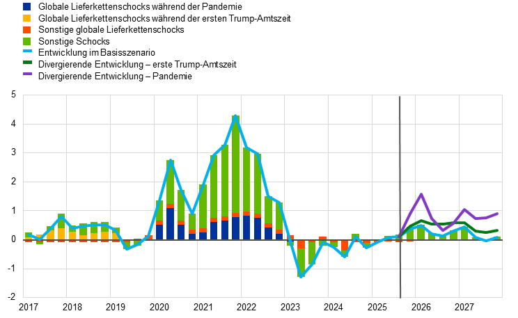 Den Projektionen zufolge wird der Anstieg der Exportpreise der Wettbewerber des Euroraums aufgrund anhaltend schwacher Exportpreise in China unter dem historischen Durchschnitt liegen. Die Exportpreise der Wettbewerber des Euroraums werden sich den Projektionen zufolge 2025 um 1,6 %, 2026 um 2,1 % und 2027 um 2,3 % erhöhen. Diese Werte liegen unter dem historischen Durchschnitt (2,6 % im Zeitraum 2000-2019), da die Teuerung bei den chinesischen Exportpreisen den Projektionen zufolge bis Ende 2026 im negativen Bereich verharren wird. Im Vergleich zu den Projektionen vom Juni 2025 spiegeln die Abwärtsrevisionen für 2025 und 2026 die Auswirkungen niedrigerer Exportpreise in China wider. Diese sind zum Teil auf die verfestigte Deflation der Erzeugerpreise und niedrigere Nahrungsmittelpreise zurückzuführen, die den Effekt etwas höherer Annahmen für die Ölpreise mehr als ausgleichen.