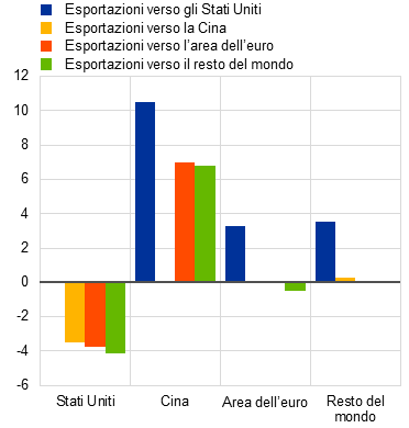 Nota: il grafico mostra le variazioni degli scambi bilaterali nel quarto trimestre del 2027 (su base non ponderata). In Cina vige un regime di cambio a fluttuazione controllata. Il resto del mondo è calcolato come media semplice delle deviazioni delle esportazioni rispetto allo scenario di base per tutte le regioni nel modello ECB-Global esclusi Stati Uniti, Cina e area dell’euro.
