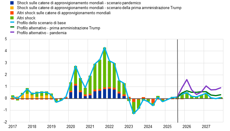 GSCPI: scomposizione degli shock, profilo dello scenario di base e profili alternativi