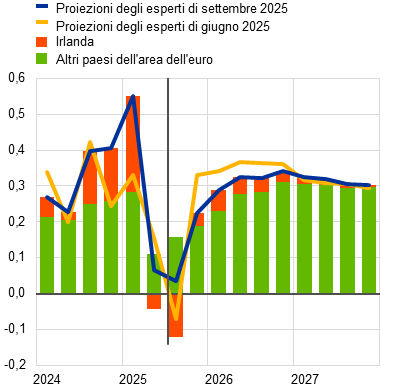 Rispetto alle proiezioni dello scorso giugno, il tasso di incremento del PIL in termini reali è stato rivisto verso l’alto di 0,3 punti percentuali per il 2025 e verso il basso di 0,1 punti percentuali per il 2026, mentre rimane invariato per il 2027. La correzione al rialzo per la proiezione relativa al 2025 rispecchia effetti di trascinamento positivi derivanti dalle revisioni dei dati storici, oltre che dati effettivi considerevolmente migliori del previsto per il primo trimestre dell’anno e gli indicatori più recenti che suggeriscono una lieve correzione verso l’alto per la crescita nel terzo trimestre (grafico 3). I dazi leggermente più elevati, la domanda esterna più debole e l’indebolimento della competitività di prezzo connesso al rafforzamento dell’euro più che compensano l’impatto del miglioramento del clima di fiducia sull’attività, determinando una correzione al ribasso di 0,1 punti percentuali per le prospettive di crescita per il 2026. Le prospettive per il 2027 rimangono invariate. In termini di componenti di spesa (grafico 2, pannello b), le revisioni maggiori relative al 2025 riguardano gli investimenti (per oltre la metà connesse agli andamenti volatili degli investimenti in prodotti di proprietà intellettuale in Irlanda) e le esportazioni nette.