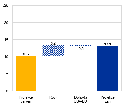 • Predpokladá sa, že efektívna colná sadzba pre vývoz tovaru z eurozóny do Spojených štátov bude 13,1 %, čo je nárast oproti sadzbe 10,2 % predpokladanej v júnových projekciách (graf A, panel a). To je dôsledkom obchodnej dohody z 27. júla 2025 a následného spoločného vyhlásenia USA a EÚ, v ktorom sa predpokladá, že colná sadzba uplatňovaná na všetok tovar, na ktorý sa nevzťahujú sektorové clá, bude 15 % alebo sadzba podľa doložky najvyšších výhod (most-favoured nation – MFN), podľa toho, ktorá bude vyššia. Na porovnanie, v projekciách z júna 2025 sa predpokladala paušálna colná sadzba 10 %. Medzi sektorové clá patri vyššie clá na oceľ a hliník (zvýšenie z 25 % v júnových projekciách na 50 %) a nové 50 % clo na obsah hliníka a ocele v 407 produktoch, ako aj na meď vo všeobecnosti. Na automobily a automobilové komponenty sa vzťahuje sadzba 15 % (pokles z 25 % v júnových projekciách), zatiaľ čo na lietadlá a lietadlové súčiastky sa momentálne uplatňuje len sadzba MFN.[4] Pokiaľ ide o výrobky, ktoré sú v súčasnosti predmetom vyšetrovania podľa § 232, konkrétne farmaceutické výrobky, polovodiče a drevo, predpokladá sa, že clo bude na úrovni sadzby platnej pred nástupom Trumpovej administratívy, čo by znamenalo sadzbu blízku nule. Po zohľadnení obchodu so službami sa efektívna colná sadzba z úrovne uvedenej v júnových projekciách zvýšila o 1,8 percentuálneho bodu na 8,1 %.