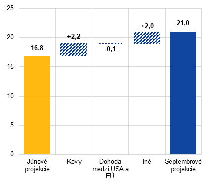 • Celková efektívna colná sadzba USA na dovoz tovaru od všetkých obchodných partnerov sa zvýšila zo 16,8 % v júnových projekciách na 21,0 % (graf A, panel b). Dôvodom je zdvojnásobenie univerzálnych ciel na oceľ a hliník (z 25 % v júnových projekciách na 50 %), ako aj pridanie 407 derivátov ocele a hliníka do zoznamu výrobkov zaťažených clom, nové univerzálne clá na meď (50 %), podpísanie bilaterálnych obchodných dohôd s kľúčovými obchodnými partnermi (napr. s Európskou úniou, Japonskom, Kóreou a Vietnamom), vyššie recipročné sadzby zavedené 7. augusta v prípade krajín, s ktorými sa nedosiahla obchodná dohoda (napr. India a Švajčiarsko), zvýšenie ciel na vývoz z Brazílie (na 50 %) a Kanady (zvýšenie ciel na 35 % na tovar, ktorý nie je v súlade s dohodou medzi Spojenými štátmi, Mexikom a Kanadou), a sekundárne clá na Indiu (ďalších 25 percentuálnych bodov) s cieľom penalizovať jej nákup ruskej ropy.