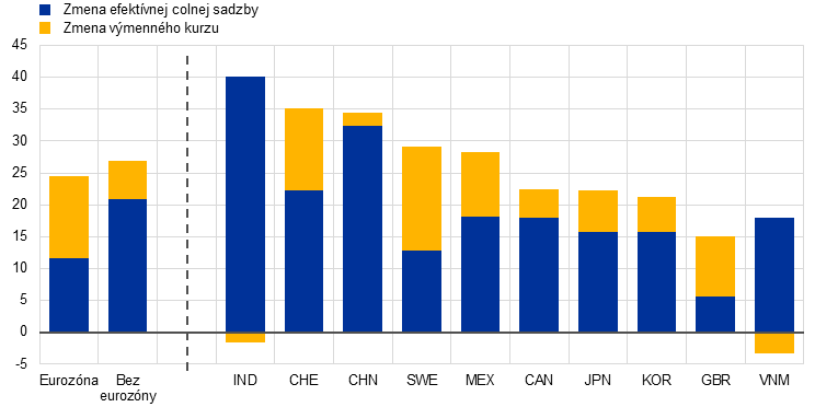V dôsledku obchodnej dohody medzi USA a EÚ a iných oznámení sú efektívne colné sadzby na dovoz USA z eurozóny a všetkých jej obchodných partnerov v porovnaní s projekciami z júna 2025 vyššie. Projekcie odborníkov ECB zohľadňujú colné sadzby, odklady a výnimky platné v čase uzávierky projekcií (28. augusta) a predpokladajú, že zostanú na rovnakej úrovni počas celého sledovaného obdobia.
