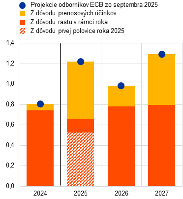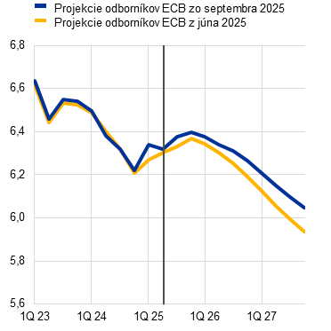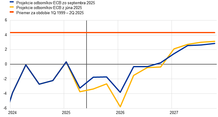 Obchodné clá a súvisiaca neistota prispeli v prvej polovici roka 2025 k výrazným výkyvom hospodárskej aktivity, s preventívnym nárastom aktivity, najmä v Írsku. Očakáva sa, že ustupovanie týchto faktorov v druhej polovici roka povedie k ďalšej volatilite, ktorá bude zahmlievať signály základnej dynamiky hospodárstva eurozóny. Odhliadnuc od volatility spôsobenej fluktuáciami írskych údajov bol hospodársky rast vo zvyšku eurozóny stabilnejší a očakáva sa, že taký zostane aj v druhej polovici roka. Hoci nová obchodná dohoda medzi USA a EÚ znamená vyššie clá na vývoz z eurozóny do Spojených štátov, pomohla zmierniť neistotu v oblasti obchodnej politiky. Neskôr počas sledovaného obdobia by sa mal hospodársky rast v eurozóne zrýchľovať s prispením niekoľkých faktorov. Rast reálnych miezd a zamestnanosti spolu s novými vládnymi výdavkami na infraštruktúru a obranu, najmä v Nemecku, by mal posilniť domáci dopyt v eurozóne. Výhľad rastu by mali podporiť aj menej reštriktívne podmienky financovania – najmä v dôsledku nedávnych menovopolitických rozhodnutí – a oživenie zahraničného dopytu v roku 2027. Ročný priemerný rast reálneho HDP má podľa projekcií dosiahnuť 1,2 % v roku 2025, 1,0 % v roku 2026 a 1,3 % v roku 2027. V porovnaní s makroekonomickými projekciami odborníkov Eurosystému z júna 2025 bol výhľad rastu HDP na rok 2025 upravený o 0,3 percentuálneho bodu nahor vzhľadom na lepšie než očakávané aktuálne údaje a prenosový efekt revízií historických údajov. Keďže nie všetky nečakané údaje súvisia s výraznejším preventívnym nárastom hospodárskej aktivity, než sa pôvodne predpokladalo, v druhej polovici roka sa očakáva len ich čiastočná kompenzácia. Zhodnotenie eura a slabší zahraničný dopyt (čiastočne v súvislosti s mierne vyššími clami, než sa predpokladalo v júnových projekciách) viedli k revízii o 0,1 percentuálneho bodu smerom nadol na rok 2026. Projekcia na rok 2027 zostáva nezmenená.[1]