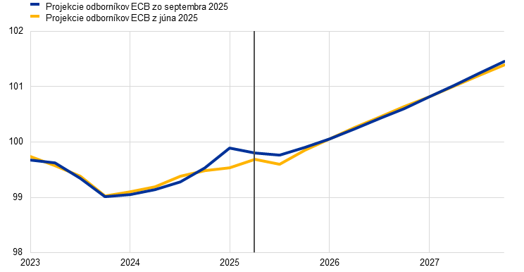 Výhľad inflácie je v súlade s jej stabilizáciou v blízkosti strednodobého cieľa na úrovni 2 %. Celková inflácia meraná harmonizovaným indexom spotrebiteľských cien (HICP) by sa mala počas zvyšku roka 2025 pohybovať stabilne okolo úrovne 2 %, v roku 2026 by mala klesnúť na 1,7 % a následne v roku 2027 vzrásť na 1,9 %. Pokles v roku 2026 odráža ďalšie postupné zmierňovanie neenergetických zložiek, pričom inflácia cien energií má zostať volatilná, ale v priebehu sledovaného obdobia má vzrásť, čiastočne v dôsledku zavedenia systému EÚ na obchodovanie s emisiami (ETS2) v roku 2027. Inflácia cien potravín by mala zostať spočiatku zvýšená, keďže sa do nej premietnu oneskorené účinky predchádzajúceho zvyšovania cien medzinárodných potravinových komodít, ale v rokoch 2026 a 2027 by sa mala mierne znížiť na úrovne mierne nad 2 %. Inflácia HICP bez energií a potravín (HICPX) má klesať vzhľadom na ústup mzdových tlakov a zmierňovanie inflácie cien služieb, ako aj zhodnocovanie eura, ktoré sa premietne do cenového reťazca a obmedzí infláciu cien tovarov. Nižší rast miezd po vyrovnaní predchádzajúcich strát reálnych príjmov v spojení s oživením rastu produktivity by mal viesť k výrazne pomalšiemu rastu jednotkových nákladov práce. V porovnaní s projekciami z júna 2025 bol výhľad celkovej inflácie HICP na roky 2025 a 2026 upravený o 0,1 percentuálneho bodu nahor v dôsledku vyššieho aktuálneho vývoja a predpokladov cien energetických komodít, ako aj oneskorených účinkov vyšších medzinárodných cien potravinových komodít, ktoré prevážili zhodnocovanie eura. V roku 2027 by mali prevládnuť oneskorené účinky zhodnocovania eura, čo vedie k revízii o 0,1 percentuálneho bodu nadol.