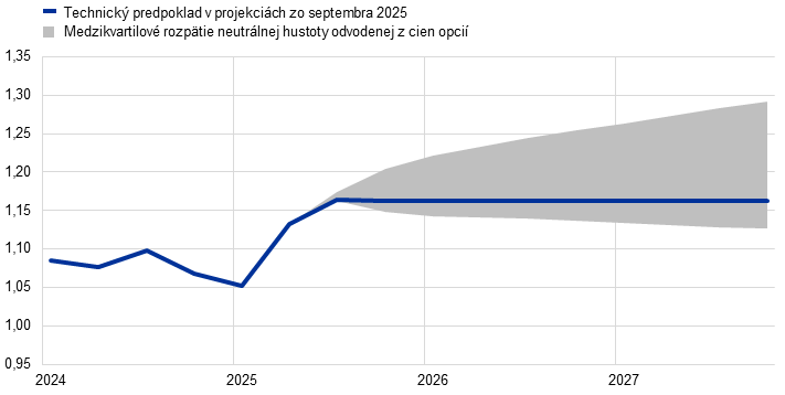 Táto analýza citlivosti posudzuje vplyvy alternatívneho vývoja výmenného kurzu, ktorý naznačuje možnosť ďalšieho tlaku na zhodnocovanie eura, a tým poukazuje na riziká pomalšieho hospodárskeho rastu a rastu inflácie. Technické predpoklady pre výmenné kurzy v základných projekciách sú počas sledovaného obdobia konštantné. Alternatívne scenáre oslabenia a posilnenia výmenného kurzu vychádzajú z 25. a 75. percentilu neutrálnych hustôt odvodených z cien opcií na výmenný kurz USD/EUR z 15. augusta 2025, pričom rozpätie bolo naklonené smerom k zhodnocovaniu eura (graf 16). Vplyv týchto alternatív sa hodnotí pomocou makroekonomických modelov odborníkov ECB a Eurosystému. Priemerný vplyv na rast produkcie a infláciu podľa týchto modelov je uvedený v tabuľke 7.