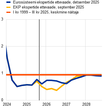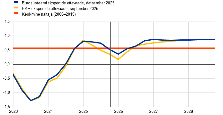Euroala majandus on hoolimata keerulisest üleilmsest keskkonnast osutunud vastupidavaks. SKP reaalkasv hoogustus 2025. aasta kolmandas kvartalis 0,3%, mis ületas septembri ettevaate prognoosi. Sellele kasvule eelnesid esimese poolaasta volatiilsed suundumused, milles kajastus USA kõrgemate kaubandustollide ja seonduva ebakindluse tõttu tegevuste ettepoole toomise mõju. Samuti peegeldasid need suundumused järske kõikumisi Iirimaa andmetes. Euroala majanduskasvu peaks endiselt tagant tõukama peamiselt sisenõudlus, mida elavdavad reaalpalkade tõus ja tööhõive suurenemine olukorras, kus vastupanuvõimelistel tööturgudel on rekordiliselt madal töötuse määr. Sisemajandust peaksid toetama ka käesoleval aastal teatavaks tehtud valitsussektorite täiendavad kulutused taristu- ja kaitsevaldkonnas, eelkõige Saksamaal, ning alates 2024. aasta juunist tehtud baasintressimäärakärbetest tulenenud soodsamad rahastamistingimused. Euroalaväliselt peaks eksport järgmisel aastal hoogustuma, ehkki jätkuvalt esineb konkurentsivõime probleeme, millest mõned on struktuurilist laadi. See hoogustumine on seotud välisnõudluse elavnemisega kaubanduspoliitikast tingitud ebakindluse vähenemise keskkonnas ning toimub olenemata kõrgemate tollimaksude mõju järkjärgulisest avaldumisest. Eurosüsteemi ekspertide prognoosi kohaselt on SKP reaalkasv 2025. aastal 1,4%, 2026. aastal 1,2%, 2027. aastal 1,4% ja 2028. aastal 1,4%. 2025. aasta septembri ettevaatega võrreldes on SKP kasvu kogu ettevaateperioodiks ülespoole korrigeeritud, võttes arvesse oodatust paremaid näitajaid, kaubanduspoliitikaga seotud ebakindluse vähenemist, tugevamat välisnõudlust ja madalamaid energiatoorme hindu.[1]