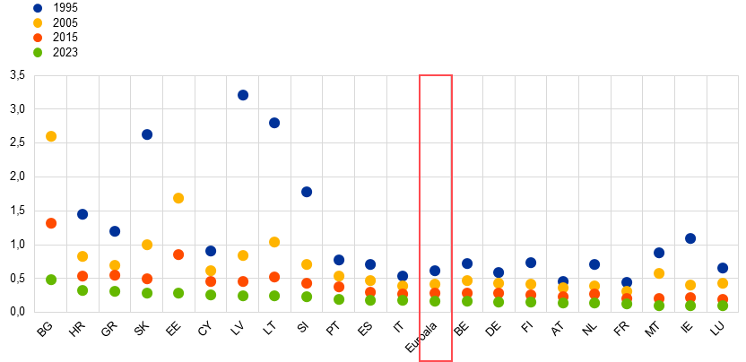 EKP on kogunud teavet kliimaga seotud eelarvemeetmete kohta alates rahapoliitika strateegia läbivaatamise lõpuleviimisest 2021. aastal. Lisateabe saamiseks nende meetmete liigitamise kohta vt „Climate-related policies in the Eurosystem/ECB staff macroeconomic projections for the euro area and the macroeconomic impact of green fiscal measures”, EKP majandusülevaade 1/2023. Meetmete mõju eelmise hinnangu kohta vt „Assessing the macroeconomic effects of climate change transition policies”, EKP majandusülevaade 1/2024.