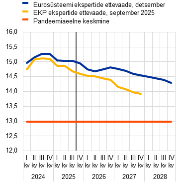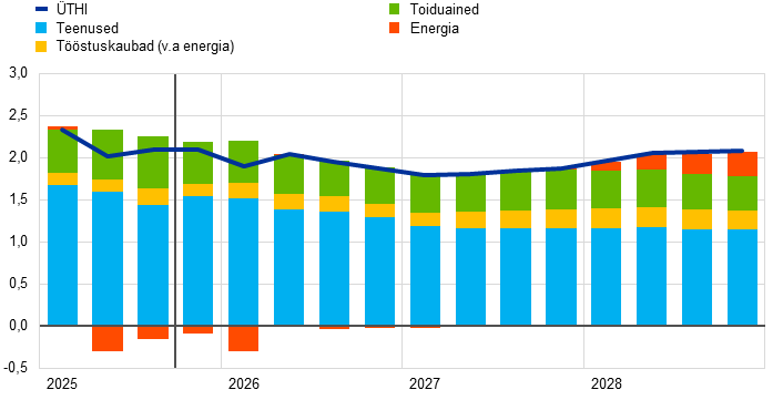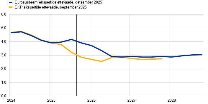 Inflatsioon peaks aeglustuma 2,1%-lt 2025. aastal 1,9%-le 2026. aastal ja 1,8%-le 2027. aastal ning hoogustuma seejärel 2028. aastal EKP keskpika aja eesmärgiks seatud 2% tasemele. Koguinflatsiooni (mõõdetuna ühtlustatud tarbijahinnaindeksi (ÜTHI) alusel) eeldatav aeglustumine 2026. aasta alguses kajastab energiahindadest tulenevat negatiivset baasefekti, samal ajal kui muude komponentide (v.a energia) inflatsioon peaks terve 2026. aasta jooksul jätkuvalt aeglustuma. Energiahindade inflatsiooni panus koguinflatsiooni peaks jääma peaaegu kuni 2027. aasta lõpuni tagasihoidlikuks ning suurenema siis 2028. aastal märkimisväärselt seoses ELi heitkogustega kauplemise süsteemi (HKS2) eeldatava rakendamisega, mis peaks suurendama koguinflatsiooni 0,2 protsendipunkti võrra. Energia komponenti arvestamata peaks ÜTHI-inflatsioon aeglustuma 2,5%-lt 2025. aastal 2,2%-le 2026. aastal ning 2,0%-le 2027. ja 2028. aastal. Toiduainehindade inflatsioon aeglustub tõenäoliselt märkimisväärselt, sest üleilmsete toidutoormehindade varasemate tõusude ja suve jooksul valitsenud ebasoodsate ilmaolude mõju taandub, ning 2026. aasta lõpu poole peaks see stabiliseeruma veidi üle 2% tasemel. ÜTHI-inflatsioon (v.a energia ja toiduained) peaks aeglustuma 2,4%-lt 2025. aastal 2,0%-le 2028. aastal, kuna tööjõukulude surve leevenemise keskkonnas aeglustub teenusehindade inflatsioon ja euro varasem kallinemine kandub üle hinnakujundusahelasse, pidurdades kaubahindade inflatsiooni. Palgakasv peaks 2026. aastal aeglustuma ning stabiliseeruma siis ligikaudu 3% juures. Seda toetavad vastupidav tööturg ja tootlikkuse kasv, mis jääb veidi alla 1%. Tööjõu ühikukulude kasv tõenäoliselt aeglustub, kuid selle mõju inflatsioonile peaks osaliselt tasakaalustama kasumimarginaalide järkjärguline elavnemine ettevaateperioodil. 2025. aasta septembri ettevaatega võrreldes on ÜTHI-koguinflatsiooni väljavaadet 2026. aastaks 0,2 protsendipunkti võrra ülespoole korrigeeritud. See kajastab hiljutisi üllatavaid andmeid ÜTHI-inflatsiooni ja palgakasvu kohta. Viimased toovad kaasa palgakasvu prognoosi märkimisväärse ülespoole korrigeerimise. ÜTHI-inflatsiooni prognoosi on 2027. aastaks veidi allapoole korrigeeritud. Selle põhjuseks on energiahindade inflatsiooni eeldatav väiksem mõju, kuna heitkogustega kauplemise süsteemi (HKS2) rakendamine peaks lükkuma 2027. aastalt edasi 2028. aastale. Samal ajal peaks seda mõju siiski osaliselt tasakaalustama teenusehindade kiirem inflatsioon.