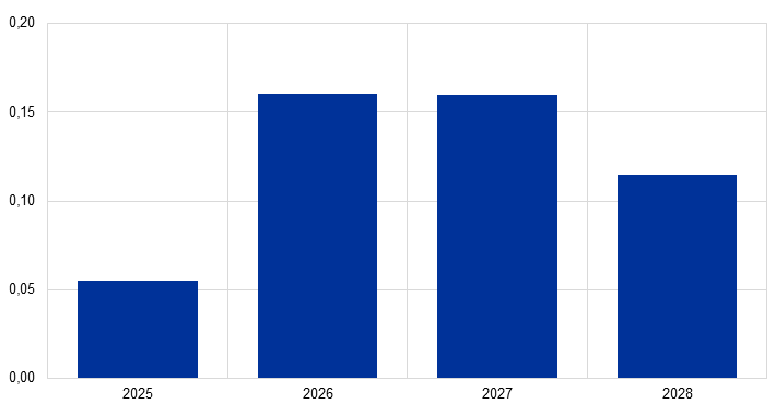 SKP aastane reaalkasv peaks ettevaateperioodil olema keskmiselt 1,3%. Seda toetavad reaalse kasutatava tulu suurenemine, ebakindluse vähenemine, tugev välisnõudlus ning kaitse- ja taristukulutustega seotud eelarvepoliitilised stiimulid. Need eeskätt Saksamaal rakendatavad eelarvemeetmed peaksid euroala SKP kasvule avaldama keskpikas ajaplaanis toetavat mõju, mis ulatub 2028. aastaks eelduste kohaselt kumulatiivselt 0,5%ni ning on suurim 2026. ja 2027. aastal (vt joonis 2).[9] Hinnangute kohaselt tuleneb SKP reaalkasvu mõningane aeglustumine – 1,4%-lt 2025. aastal 1,2%-le 2026. aastal – väiksemast siirdemõjust 2026. aastal, tingituna mõnevõrra tagasihoidlikumast eeldatavast kasvust 2025. aasta teisel poolel. Seejärel peaks aastane SKP reaalkasv tugevneva siirdemõju toel kiirenema ja stabiliseeruma 2027. ja 2028. aastal 1,4% tasemel, mis tuleneb sarnasest siirde- ja aastasisesest mõjust mõlemal aastal. Kui kasutada Iirimaa SKP asemel Iirimaa muudetud sisenõudluse näitajat, kiireneb euroala SKP reaalkasv mõõdukamas tempos, kerkides 1,0%-lt 2025. aastal 1,1%-le 2026. aastal ning 1,3%-le nii 2027. kui ka 2028. aastal.