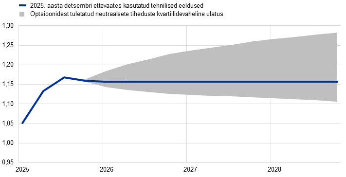 Vahetuskursi turupõhised jaotused on kaldu euro edasise kallinemise suunas, mis osutab mõningatele majanduskasvu ja inflatsiooni mõjutavatele langusriskidele. Ettevaate põhistsenaariumis sisalduvad vahetuskursside tehnilised eeldused hoitakse ettevaateperioodil muutumatuna. Alternatiivsed langus- ja tõususuunad on tuletatud 25. ja 75. protsentiiliga jaotusest, mis on saadud USD/EUR vahetuskursi optsioonidest tuletatud riskineutraalsetest tihedustest (seisuga 26. november 2025), mis olid kaldu euro mõningase kallinemise suunas (vt joonis 16). Nende alternatiivsete arengusuundade mõju hinnatakse EKP ja eurosüsteemi ekspertide makromajanduslike mudelite abil. Tabelis 7 on esitatud nende mudelite alusel prognoositud keskmine mõju toodangu kasvule ja inflatsioonile.