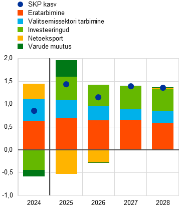 SKP reaalkasvu peaks jätkuvalt vedama sisenõudlus, kusjuures netoekspordi negatiivne mõju peaks vähenema 2027.–2028. aastal nullini. Kulude vaatest (vt joonis 3, graafik a) peaks eratarbimine kogu ettevaateperioodil jõuliselt kasvama, avaldades SKP reaalkasvule kõige suuremat mõju. Kodumajapidamiste kulutuste kasvu peaks toetama nende suurenev ostujõud, mis kajastab palkade ja tööhõive jõulist kosumist jätkuvalt vastupidava tööturu tingimustes. Lisaks sellele peaks investeeringute kasv olema kogu ettevaateperioodil SKP kasvust kiirem. Erasektori investeeringud kompenseerivad 2027. ja 2028. aastal eelduste kohaselt avaliku sektori investeeringute vähenemise, mis tuleneb ELi taasterahastust eraldatavate toetuste lõppemisest. Ettevaateperioodil peaksid investeeringute kasvu toetama ebakindluse vähenemine, suuremad kaitse- ja taristukulutused ning tsüklilise taastumisega seotud kasumite kasv ja paranenud nõudlustingimused. Ekspordikasv peaks aga püsima välisnõudluse paranemisest hoolimata tagasihoidlik, sest euroala jätkuvad konkurentsivõime probleemid, USA tollimaksud ja euro varasem kallinemine pärsivad eksporditegevust. See toob tõenäoliselt kaasa ekspordi turuosade edasise vähenemise. Selle tulemusena avaldab netoeksport prognoosi kohaselt 2025. ja 2026. aastal SKP reaalkasvule negatiivset mõju ning impordikasv on ekspordikasvust kiirem. Eelduste kohaselt tasakaalustab negatiivset mõju osaliselt varude muutuste positiivne mõju 2025. aastal.