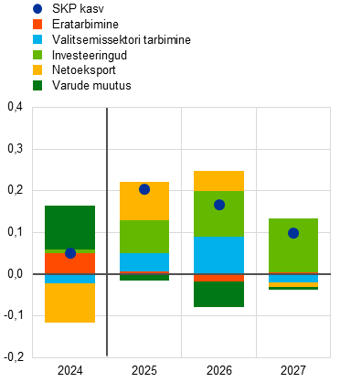 2025. aasta septembri ettevaatega võrreldes on SKP reaalkasvu prognoosi korrigeeritud 2025. ja 2026. aastaks 0,2 protsendipunkti ja 2027. aastaks 0,1 protsendipunkti võrra ülespoole (vt joonis 3, graafik b). 2025. aasta prognoosi ülespoole korrigeerimine kajastab varasemate andmete muutumist, sealhulgas 2025. aasta kolmanda kvartali oodatust paremaid tulemusi. 2026. aasta kasvuväljavaate ülespoole korrigeerimine on tingitud mõnevõrra väiksemast kaubanduspoliitikaga seotud ebakindlusest, jõulisemast välisnõudlusest ja madalamatest energiatoorme hindadest. 2027. aasta väljavaate mõningane ülespoole korrigeerimine tuleneb veidi tugevamast kvartaalsest kasvudünaamikast ja 2026. aasta hoogsama kasvutempo suuremast siirdemõjust. Kulukomponentide arvestuses on 2025.–2027. aasta suurimad ülespoole korrigeerimised seotud investeeringutega ja eelkõige ettevõtlusinvesteeringute kasvuga kogu ettevaateperioodil, aga ka dünaamilisemate valitsemissektori investeeringutega 2027. aastal ning valitsemissektori tarbimise kasvuga 2025.–2026. aastal. Ka netokaubanduse prognoosi on 2025. aastaks ülespoole korrigeeritud, mis kajastab oodatust paremaid eksporditulemusi aasta esimeses kolmes kvartalis.