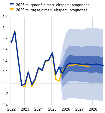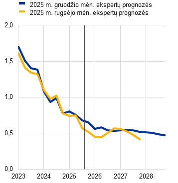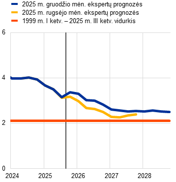 Šaltiniai: EBPO ekonomikos perspektyvos vertinimas, 2025 m. gruodžio 4 d.; Consensus Economics prognozės, 2025 m. gruodžio 11 d. (2027 ir 2028 m. duomenys – iš 2025 m. spalio mėn. apklausos); Europos Komisijos 2025 m. rudens ekonominė prognozė, 2025 m. lapkričio 17 d.; ECB profesionaliųjų prognozuotojų apklausa, 2025 m. spalio 31 d.; TVF pasaulio ekonomikos perspektyvos vertinimas, 2025 m. spalio 14 d.