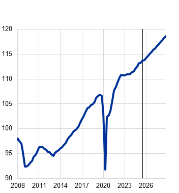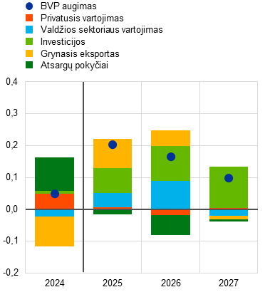 Nepaisant sudėtingos pasaulinės aplinkos, euro zonos ekonomika išlieka atspari. 2025 m. trečiąjį ketvirtį realusis BVP padidėjo 0,3 %, t. y. viršijo rugsėjo mėn. prognozes. Prieš tai, pirmąjį pusmetį, buvo didelių svyravimų, kuriuos skatino prekybos paankstinimas reaguojant į didesnius JAV prekybos muitus ir su tuo susijęs neapibrėžtumas, taip pat dideli Airijos duomenų pokyčiai. Euro zonos ekonomikos augimą ir toliau labiausiai turėtų skatinti vidaus paklausa, o ją turėtų palaikyti atsparių darbo rinkų ir rekordiškai žemo nedarbo lygio sąlygomis didėjantis darbo užmokestis bei užimtumas. Vidaus ekonomiką turėtų palaikyti ir šiemet paskelbtos papildomos valdžios sektoriaus išlaidos infrastruktūrai ir gynybai (ypač Vokietijoje) ir dėl nuo 2024 m. birželio mėn. mažintų pinigų politikos palūkanų normų pagerėjusios finansavimo sąlygos. Kalbant apie išorės aplinką, eksportas kitais metais turėtų suaktyvėti, nors konkurencingumo problemos – kai kurios iš jų yra struktūrinio pobūdžio – dar neišnyko. Didesnis eksporto aktyvumas siejamas su tuo, kad, mažėjant prekybos politikos neapibrėžtumui, atsigauna užsienio paklausa, nepaisant vis labiau pasireiškiančio didesnių muitų poveikio. Prognozuojama, kad vidutinis metinis realusis BVP 2025 m. augs 1,4 %, 2026 m. – 1,2 %, 2027 ir 2028 m. – po 1,4 %. Palyginti su 2025 m. rugsėjo mėn. prognozėmis, BVP augimo prognozė visam prognozių laikotarpiui buvo padidinta, atsižvelgiant į geresnius, negu tikėtasi, duomenis, sumažėjusį prekybos politikos neapibrėžtumą, didesnę užsienio paklausą ir mažesnes energijos žaliavų kainas[1].