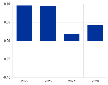 9. Apskaičiuota, kad į pagrindinį scenarijų įtrauktas poveikis infliacijai 2025–2028 m. iš viso bus mažesnis nei 0,1 procentinio punkto.