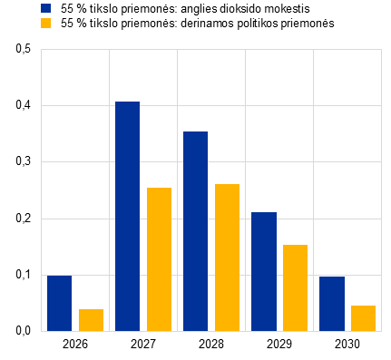 16. Į prognozių pagrindinį scenarijų neįtrauktas jokių kitų ES priemonių, įeinančių į Pasirengimo įgyvendinti 55 % tikslą priemonių rinkinį, poveikis, nes tų priemonių poveikis nebuvo apskaičiuotas arba nėra reikšmingas. Tai atitinka Europos Komisijos 2025 m. rudens ekonominę prognozę, kurioje įvertina, kad pasienio anglies dioksido korekcinio mechanizmo poveikis infliacijai trumpuoju laikotarpiu bus nereikšmingas.