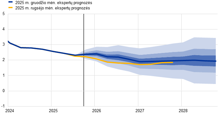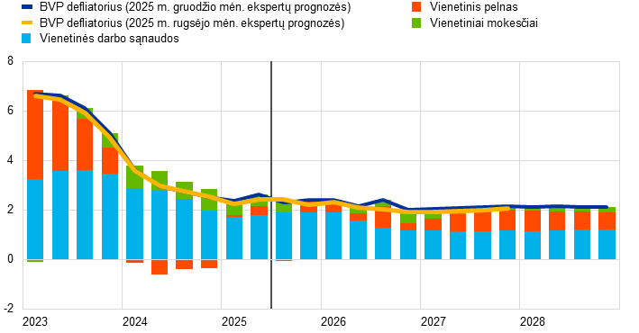 Prognozuojama, kad infliacija nuo 2025 m. 2,1 % lygio 2026 m. smuktels iki 1,9 %, 2027 m. – iki 1,8 %, o 2028 m. pakils iki ECB siekiamo 2 % vidutiniu laikotarpiu lygio. Bendrosios infliacijos (matuojamos pagal suderintą vartotojų kainų indeksą – SVKI) sumažėjimas 2026 m. pradžioje numatomas atsižvelgiant į infliaciją mažinantį energijos kainų bazės efektą, o ne energijos dedamųjų infliacija turėtų mažėti visus 2026 m. Energijos kainų infliacijos poveikis bendrajai infliacijai turėtų išlikti nedidelis iki pat 2027 m. pabaigos, o vėliau, ypač 2028 m., šis poveikis greičiausiai padidės dėl numatomo antrosios ES apyvartinių taršos leidimų prekybos sistemos (ATLPS2) įgyvendinimo; bendroji infliacija dėl to turėtų padidėti 0,2 procentinio punkto. Infliacija pagal SVKI, neįskaitant energijos, nuo 2025 iki 2026 m. turėtų sumažėti nuo 2,5 iki 2,2 %, o 2027 ir 2028 m. – iki 2,0 %. Išblėsus poveikiui, kurį kėlė ankstesnis pasaulinių maisto žaliavų kainų augimas ir visą vasarą tvyrojusios nepalankios meteorologinės sąlygos, maisto produktų kainų infliacija turėtų pastebimai sumažėti ir nuo 2026 m. pabaigos stabilizuotis 2 % šiek tiek viršijančiame lygyje. Prognozuojama, kad infliacija pagal SVKI, neįskaitant energijos ir maisto produktų, 2025–2028 m. sumažės nuo 2,4 iki 2,0 %, nes, švelnėjant darbo sąnaudų spaudimui, mažės paslaugų infliacija, o ankstesnio euro brangimo poveikiui persiduodant per kainodaros grandinę, lėčiau kils ir prekių kainos. Darbo užmokesčio augimas turėtų ir toliau lėtėti visus 2026 m., o vėliau stabilizuotis maždaug 3 % lygyje, palaikomas atsparios darbo rinkos ir kiek mažesnio nei 1 % našumo augimo. Vienetinės darbo sąnaudos turėtų augti vis lėčiau, tačiau jų poveikį infliacijai prognozių laikotarpiu turėtų iš dalies atsverti nuoseklus pelno maržų atsigavimas. Palyginti su 2025 m. rugsėjo mėn. prognozėmis, bendrosios infliacijos pagal SVKI prognozė 2026 m. padidinta 0,2 procentinio punkto, atsižvelgiant į netikėtus pastarojo laikotarpio infliacijos pagal SVKI ir darbo užmokesčio augimo duomenis; dėl pastarųjų pastebimai padidinta ir darbo užmokesčio prognozė. Infliacijos pagal SVKI 2027 m. prognozė šiek tiek sumažinta atsižvelgiant į prielaidas dėl mažesnio energijos kainų infliacijos poveikio, nes dabar numatoma, kad ATLPS2 įgyvendinimas vietoj 2027 m. bus atidėtas iki 2028 m., nors šį poveikį turėtų iš dalies atsverti didesnė paslaugų infliacija.
