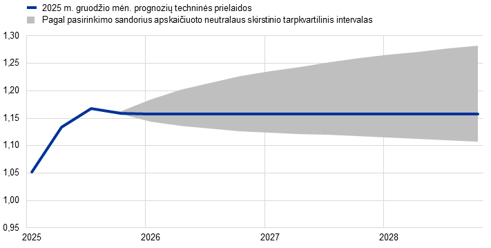 Pastabos: padidėjimas reiškia, kad euras brangsta. 25-asis ir 75-asis procentiliai – neutralūs pagal pasirinkimo sandorius apskaičiuotų JAV dolerio ir euro kurso, fiksuoto 2025 m. lapkričio 26 d., skirstiniai. Nurodomas makroekonominis poveikis yra ECB ir Eurosistemos ekspertų parengtų įvairių makroekonominių modelių vidurkis.