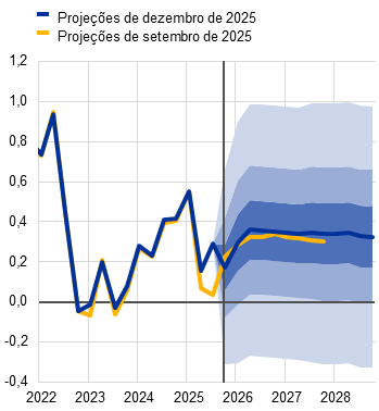 1. A data de fecho da informação subjacente aos pressupostos técnicos e às projeções para a economia mundial foi 26 de novembro de 2025. As projeções macroeconómicas para a área do euro foram finalizadas em 3 de dezembro de 2025. As projeções de dezembro de 2025 para a área do euro incluem a Bulgária, atendendo à sua adesão à área do euro em 1 de janeiro de 2026. Os dados históricos relativos à área do euro também incluem a Bulgária para todas as variáveis, exceto o Índice Harmonizado de Preços no Consumidor.