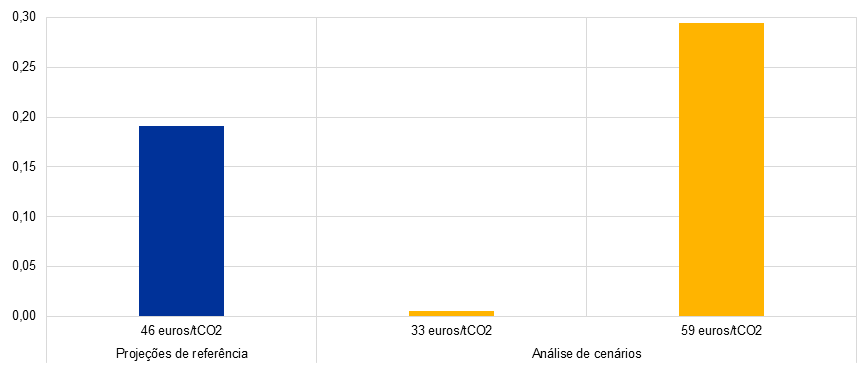 24. O impacto do CELE 2 na taxa de inflação medida pelo IHPC em 2028 ascende a 0,2 pontos percentuais. No entanto, a projeção para a inflação medida pelo IHPC situa‑se apenas 0,1 pontos percentuais acima da taxa excluindo o CELE 2, devido a efeitos de arredondamento.