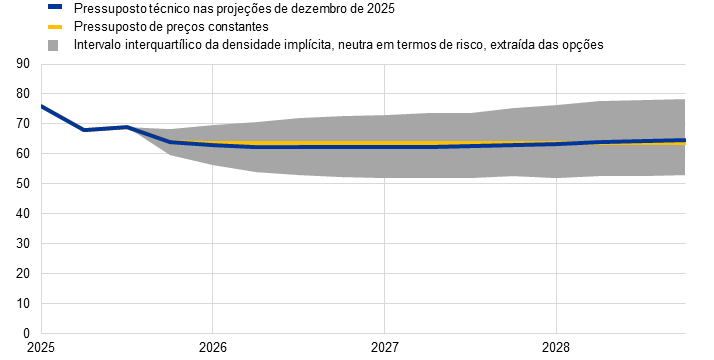 No que diz respeito aos pressupostos técnicos, comparativamente às projeções de setembro, as alterações são, em geral, limitadas, exceto no tocante aos pressupostos relativos aos preços dos produtos energéticos e do sistema de comércio de licenças de emissão vigente. Os pressupostos referentes ao preço do petróleo foram objeto de uma revisão em baixa, em média, de cerca de 4% para 2026 e 2027, e os relativos ao preço por grosso do gás em 8,6%, enquanto o pressuposto baseado nos futuros relativo ao preço das licenças de emissão no âmbito do sistema de comércio de licenças de emissão vigente (o CELE 1) aumento consideravelmente, subindo cerca de 15%. Na sequência de anúncios recentes, pressupõe‑se agora que a introdução do CELE 2 seja adiada por um ano, para 2028, sendo o preço pressuposto assente no preço utilizado pela Comissão Europeia nas suas previsões económicas do outono de 2025 (46 euros por tonelada de CO2, o que é significativamente inferior ao valor de 59 euros por tonelada de CO2 pressuposto para 2027 nas anteriores projeções do Eurosistema/BCE; ver a caixa 2 para mais pormenores)[6]. O euro registou uma depreciação de 0,5% face ao dólar dos Estados Unidos e de 0,1% em termos efetivos nominais desde as projeções de setembro. Os pressupostos relativos às taxas de juro de curto prazo foram revistos apenas marginalmente, ao passo que os relativos às taxas de longo prazo foram objeto de uma revisão em baixa de 0,2 pontos percentuais tanto para 2026 como para 2027.