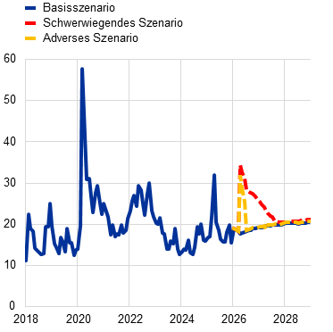 Im schwerwiegenden Szenario wird angenommen, dass die Energiepreise stärkere und länger anhaltende Auswirkungen haben und von den Auswirkungen der erhöhten Unsicherheit begleitet werden. Das Wachstum des realen BIP fällt in den Jahren 2026 und 2027 um 0,5 bzw. 0,4 Prozentpunkte niedriger aus, wobei die vierteljährlichen Wachstumsraten im zweiten und dritten Quartal 2026 im negativen Bereich liegen (siehe Abbildung 14, Grafik a). Während der Energieschock nach wie vor die Hauptursache ist, spielt die Unsicherheit zusammen mit globalen Übertragungseffekten auch eine Rolle und verstärkt den Abschwung. Die HVPI-Inflation ist 2026 um 1,8 Prozentpunkte höher und bleibt erhöht. Im Jahr 2027 liegt sie 2,8 Prozentpunkte und im Jahr 2028 0,7 Prozentpunkte über dem Basisszenario. Die Auswirkungen auf die HVPIX-Inflation sind stärker als im adversen Szenario, um mehr als 1 Prozentpunkt in den Jahren 2027 bis 2028.